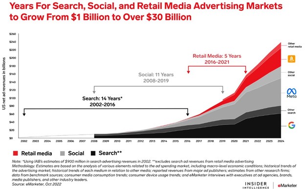 Perakende medya şu anda medyanın 3. dalgası olarak adlandırılıyor. Geneleksel medyayı yıkan ilk dalga Google Search’tü, ikinci dalga sosyal medyanın doğuşu ve 3. dalga ise perakende medya. Emarketer’a göre 2024’te perakende medya hacminin dünya genelinde 148 milyar $, 2028’te ise 261 milyar $ olması bekleniyor. 2024’te pazarın %80’i ABD ve Çin’de dönüyor. ABD’de perakende medya harcamaları dijital medyanın %25’ine, toplam medyanın ise %15’ine gelmiş durumda. Dünyanın kalanında ise hala %5 seviyelerinde. 2 büyük ekonomiyi hariç tutarsak, hala yolun başındayız.